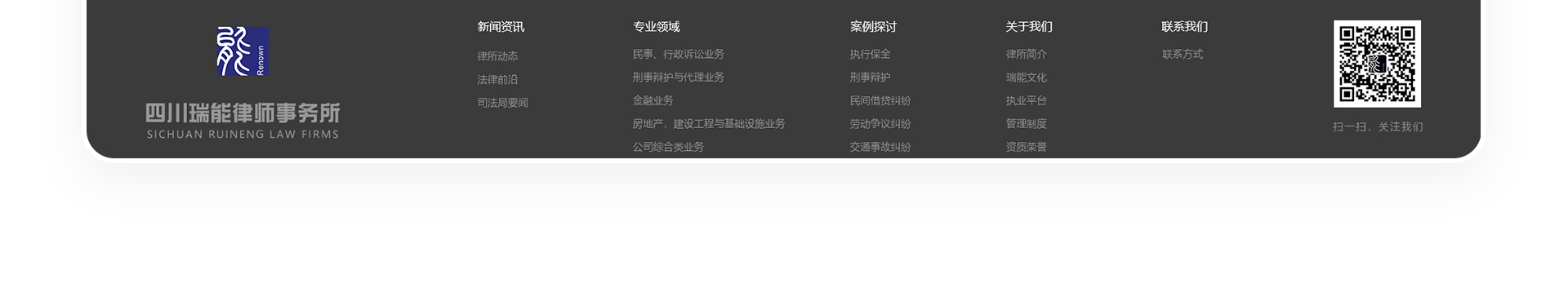 四川瑞能律师事务所是由从事法律服务工作近二十年的资深律师组建而成的一家综合性合伙制律师事务所,将"诚信、专业、责任、共赢”作为瑞能律师的执业理念,将"法律至上,全心全意提供优质法律服务,努力维护委托人的合法权益,坚决维护法律的尊严和社会的公正”作为瑞能律师的服务宗旨。