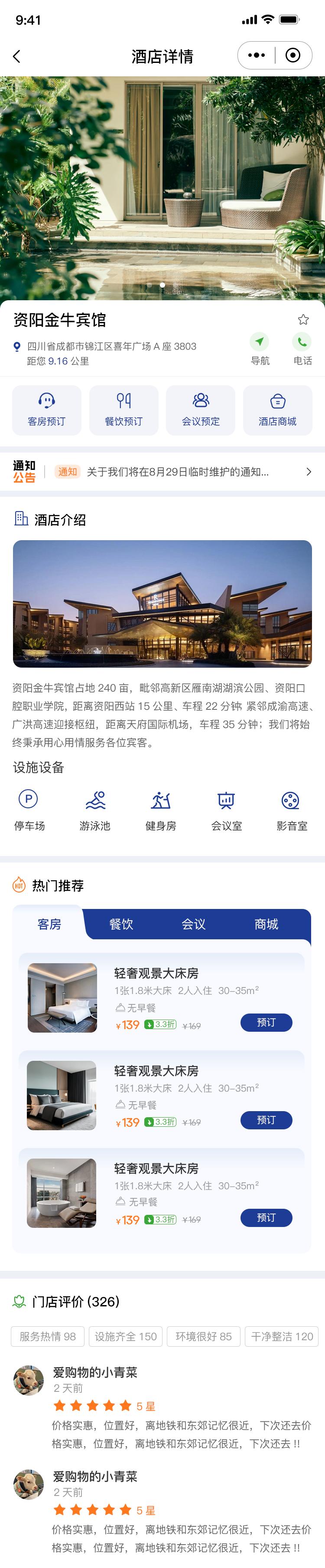 酒店地址 用文字+地图的方式详细展示酒店的地址,点击可跳转到地图导航,方便用户找到酒店