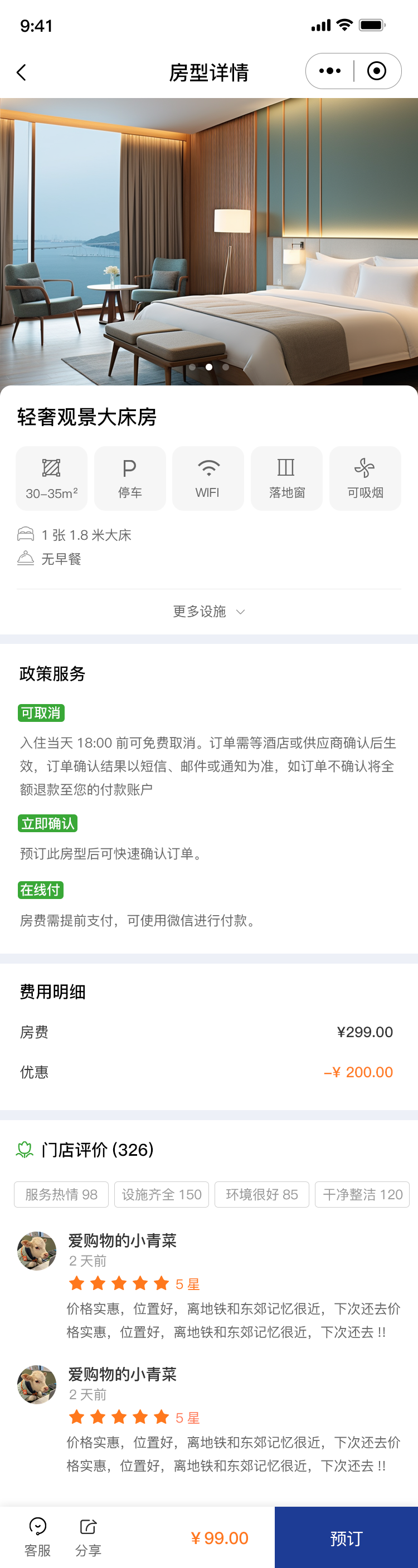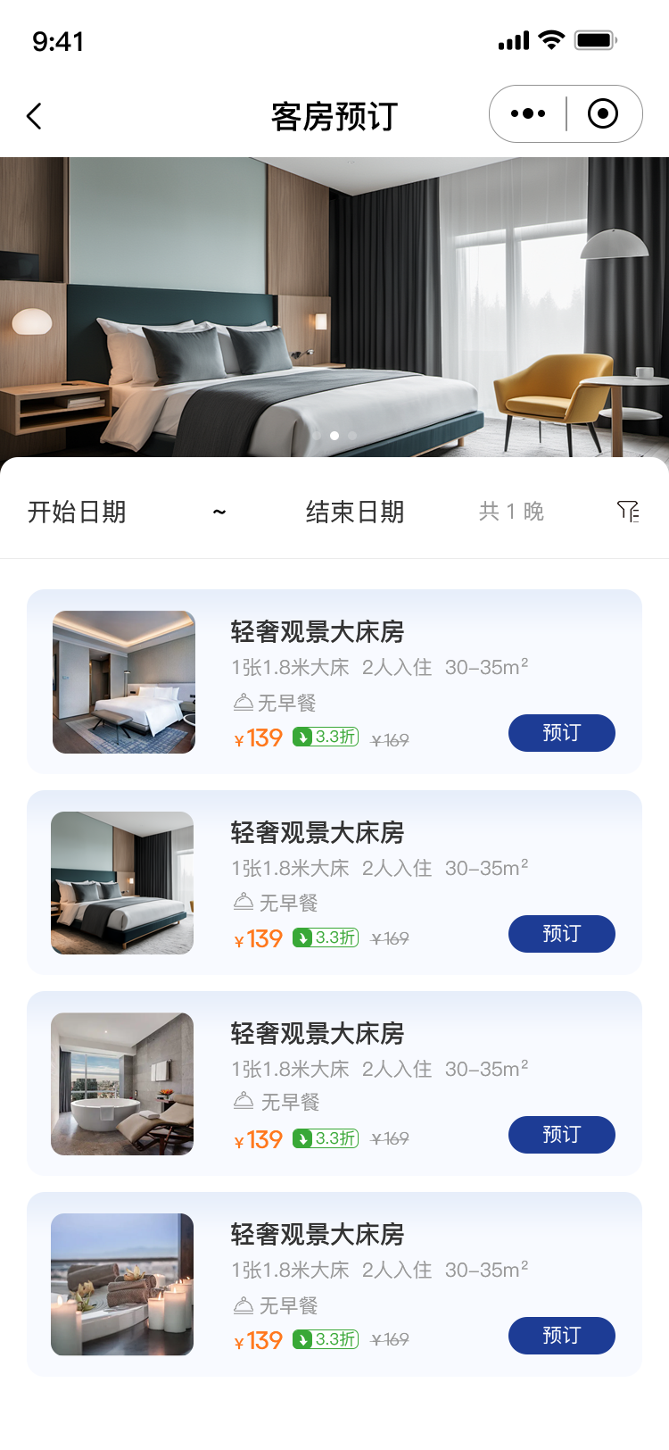 客房预订 1、房型展示,展示房型缩略图、房型类别、是否含早、是否可取消、房间价格等信息。