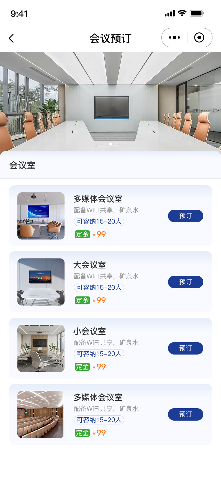 会议室展示 列表的形式展示所有的会议室,会议室缩略图、名称、容纳人数(如:5~10人)