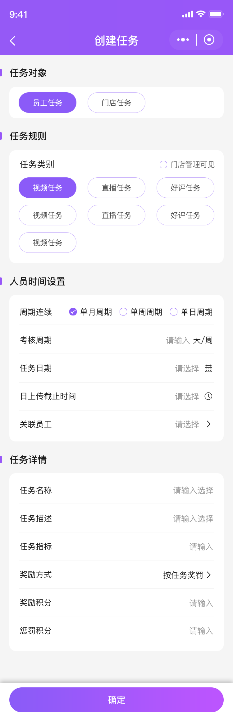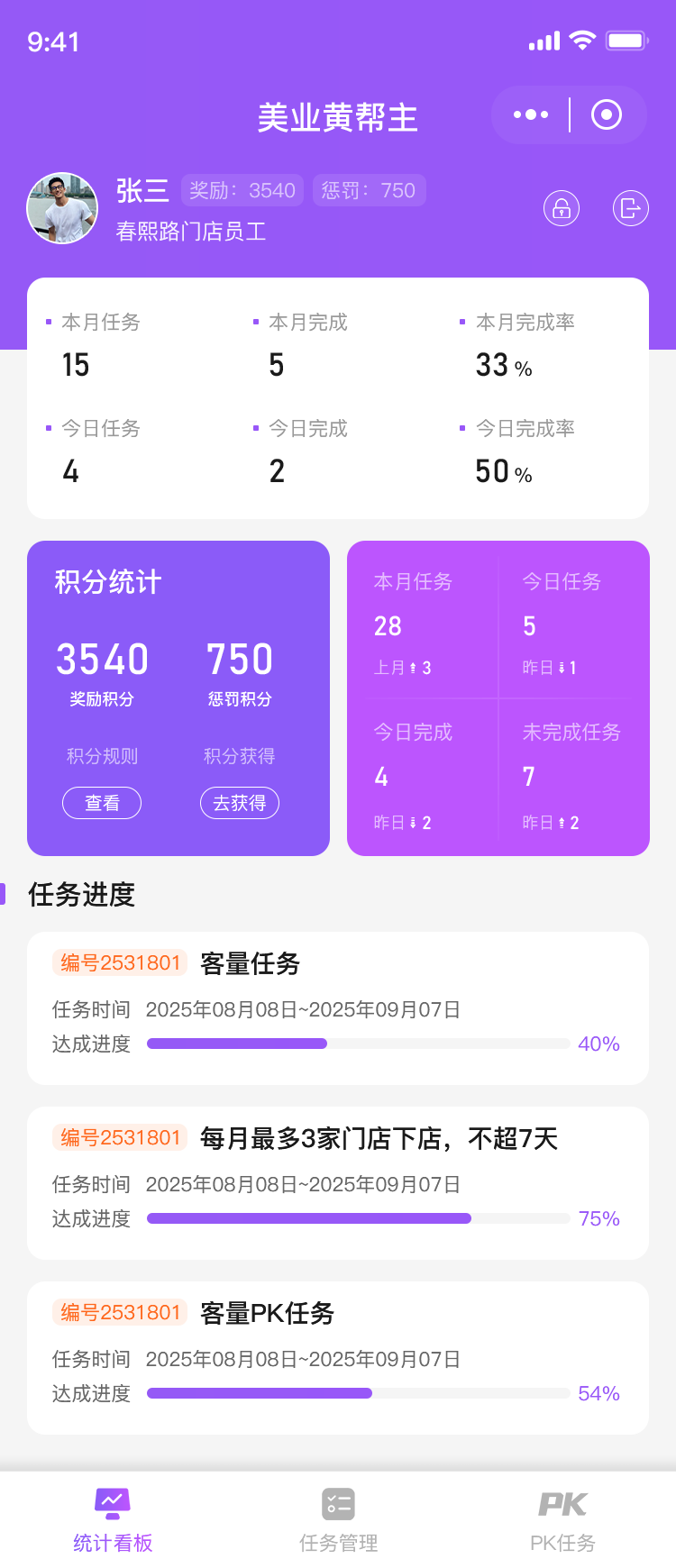 2.店长可看到整个任务的进度,店长也可以发布任务进行任务分配,做任务时进行线下拍照上传后台进行任务完成评分表现考核。