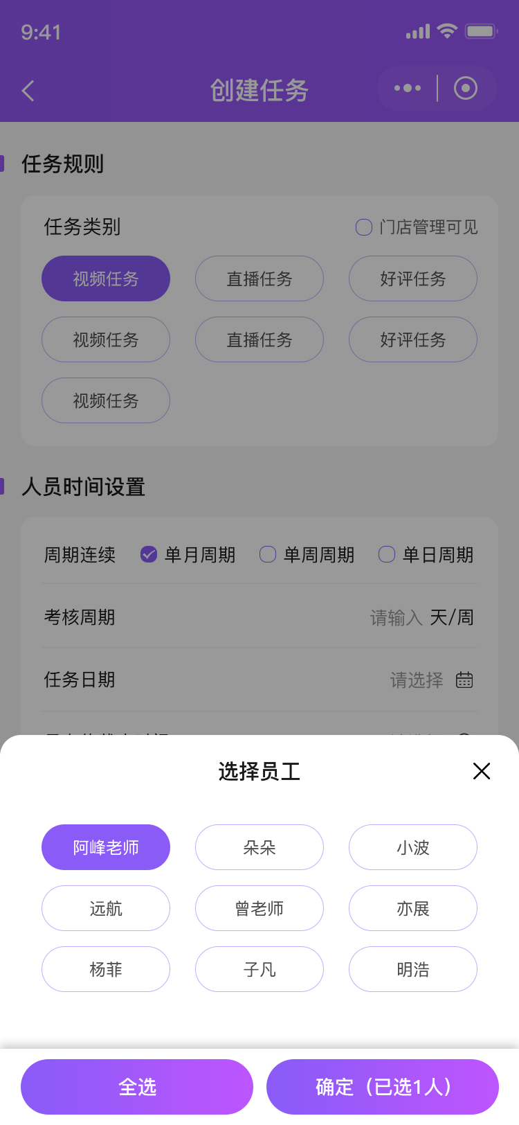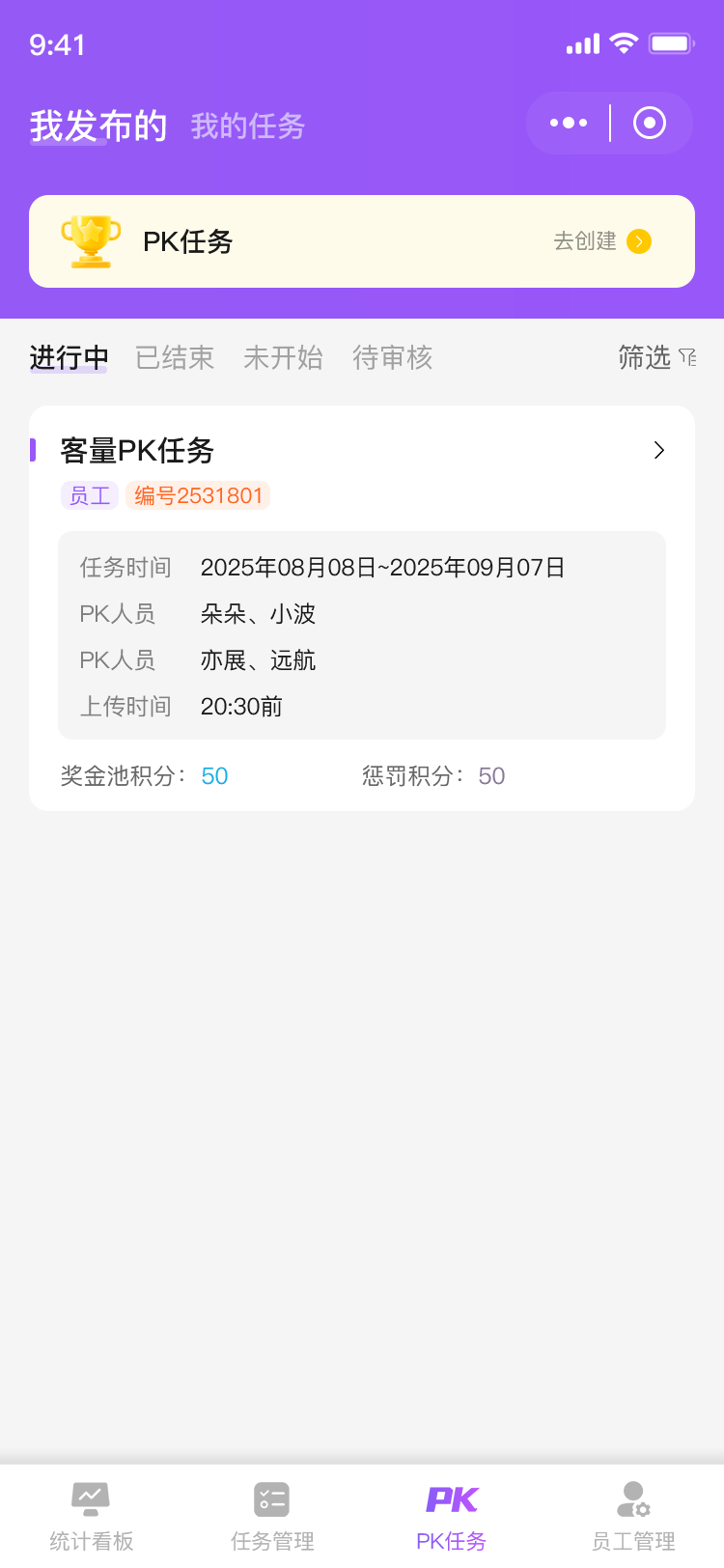 1.督导端由后台创建分配账号,根据自己所在的辖区查看门店以及门店下面的员工,当督导发布任务选择对应的执行人(门店店长,门店员工)输入任务内容和类型以及奖励机制进行后台审核,对于任务类型分为PK模式 单人和组合。